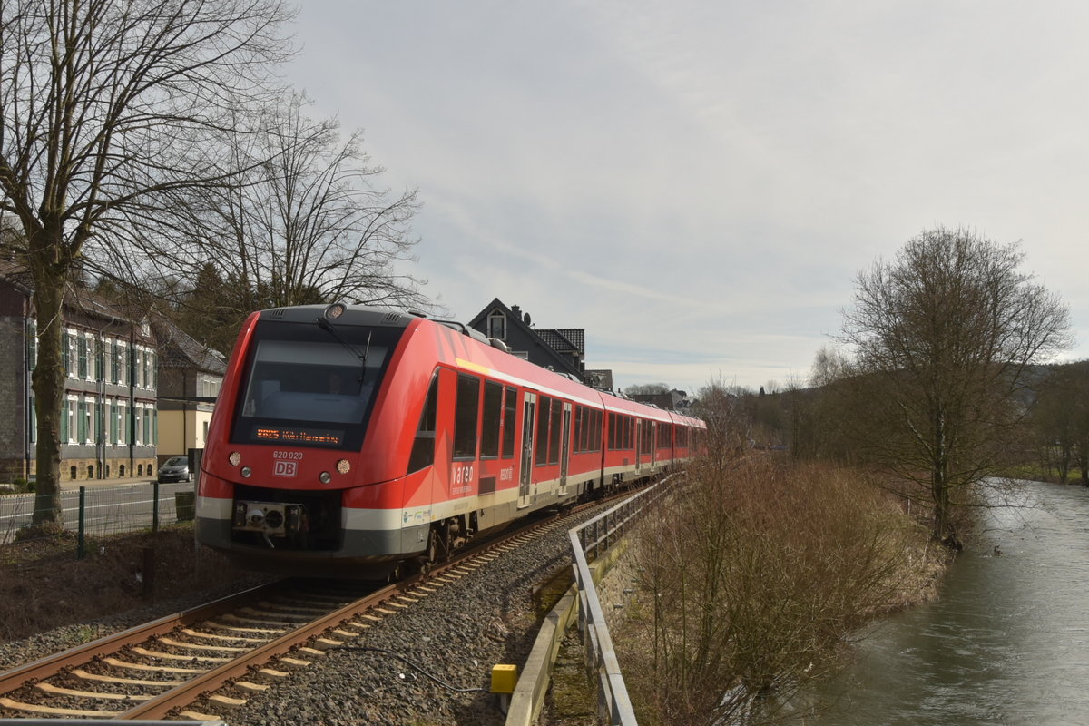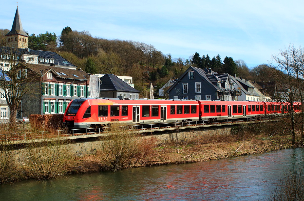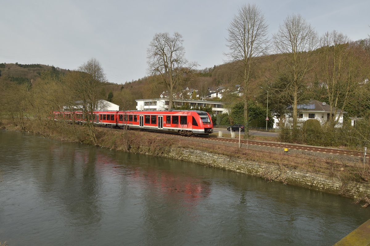 Ein RB 25 kommt hier nach Engelskirchen herangefahren, gleich hat er den Bahnhof erreicht und fährt seinem Ziel Meinerzhagen entgegen. Samstag 11.3.2017 Andreas Strobel
