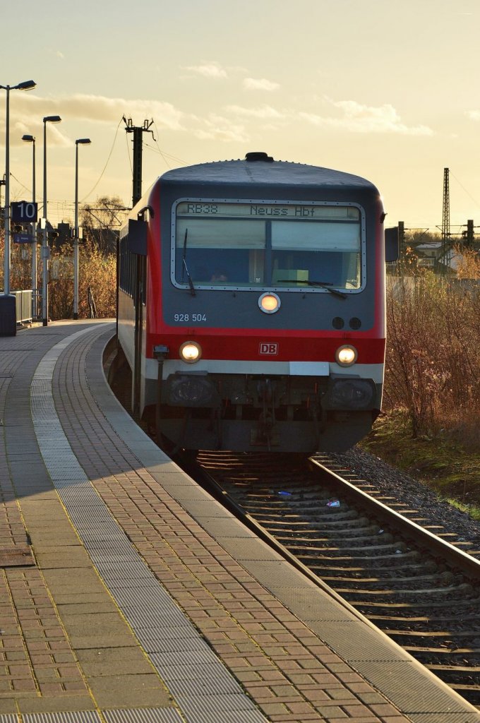 Am Bahnsteig Gleis 10, dem Gleisabschnitt der in Richtung Aachen von der Erftbahn abzweigt steht der 928 504 und wartet auf den Abfahrbefehl in Richtung Neuss Hbf.25.11.2012 Andreas Strobel
