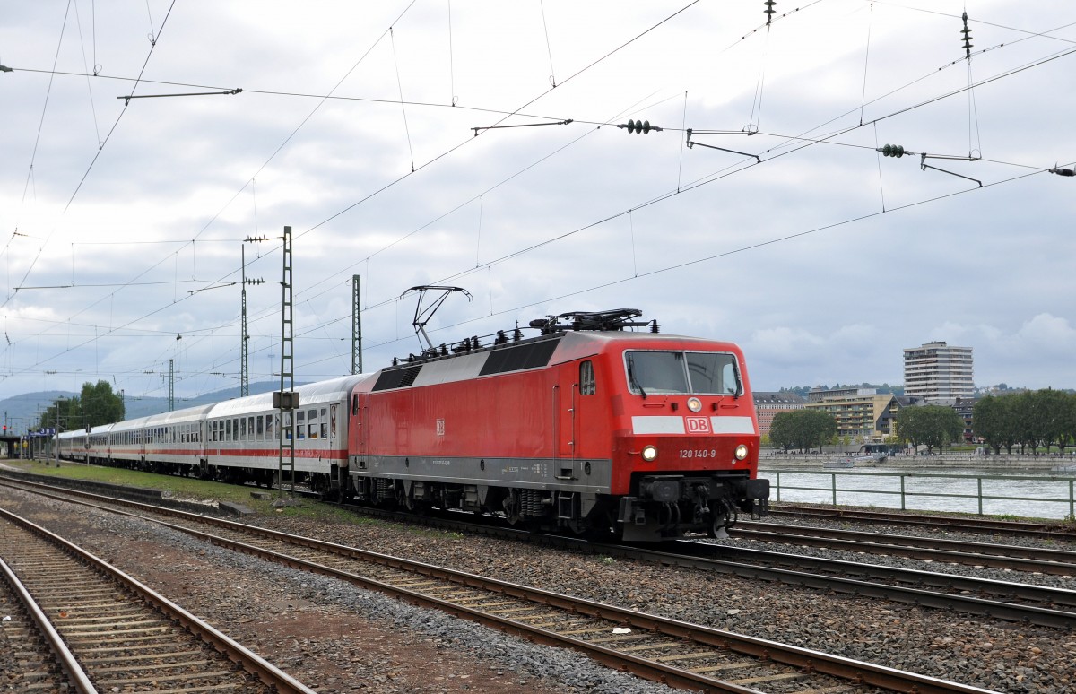 DB Schenker Rail 155 091 mit gemischtem Güterzug auf der rechten Rheinstrecke in Richtung Rüdesheim (Koblenz-Ehrenbreitstein, 14.08.2012).