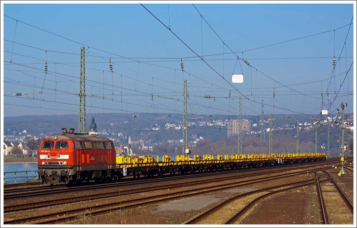 Die 218 261-6 der Bahnbau Gruppe (DB Gleisbau) fährt am 09.03.2014 mit einem Langschienenzug durch Koblenz-Ehrenbreitstein in Richtung Süden (Rheinaufwärts).