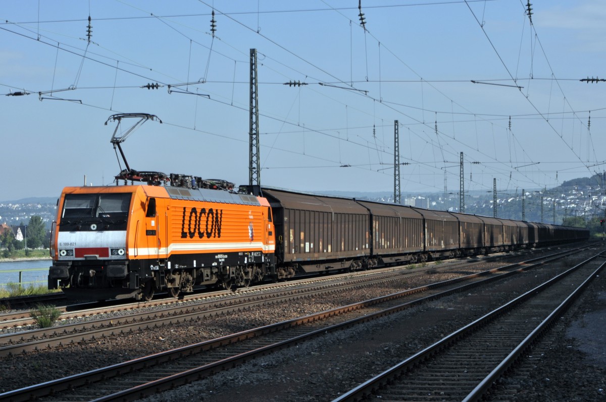 DB Schenker Rail 185 271 und 185 317 mit Schüttgutwagenzug auf der rechten Rheinstrecke in Richtung Rüdesheim (Koblenz-Ehrenbreitstein, 17.08.2013).