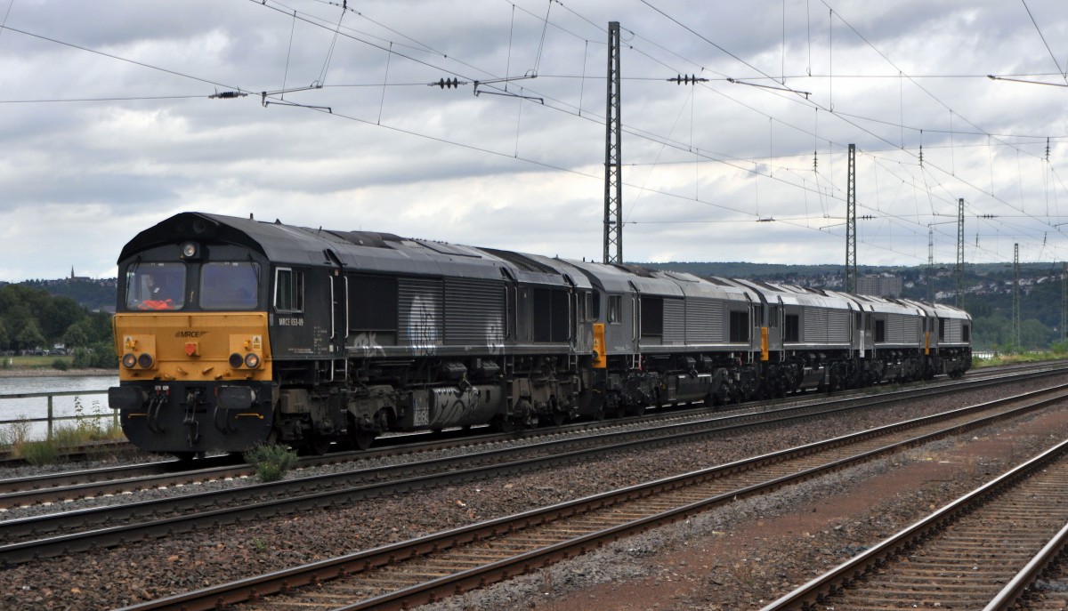 DB Schenker Rail 151 043 und 151 071 mit Brammenzug in Richtung Köln (Koblenz-Ehrenbreitstein, 18.05.13).