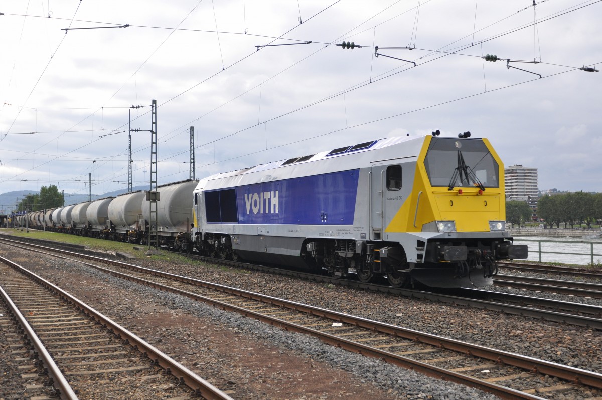 Voith 264 001 (für Stock Transporte fahrend) befindet sich am 06.10.13 mit einem Tankwagenzug in KO-Ehrenbreitstein auf dem Weg Richtung Norden.
