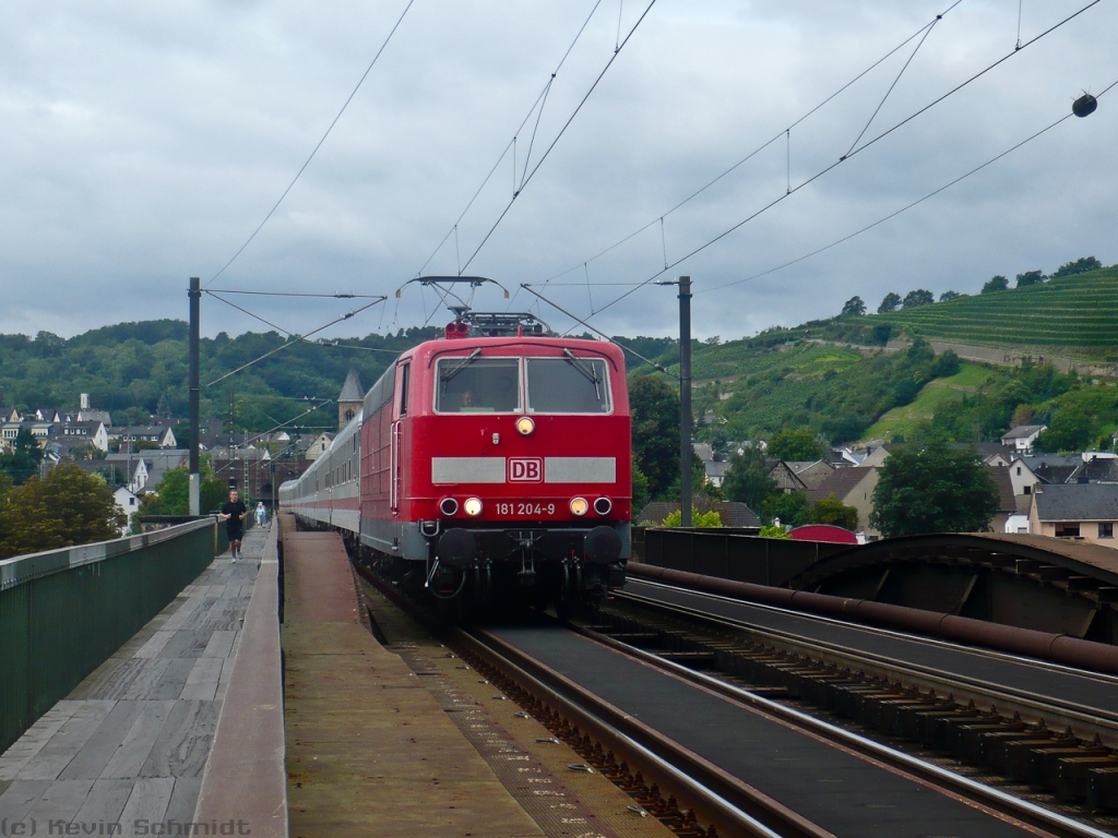 Tag 6: 181 204-9 überquert gerade mit dem IC 333 die Moselbrücke zwischen den Stationen Güls und Moselweiß. Sie bringt den aus Luxembourg kommenden Zug noch bis Koblenz Hbf, der in Kürze erreicht sein wird.