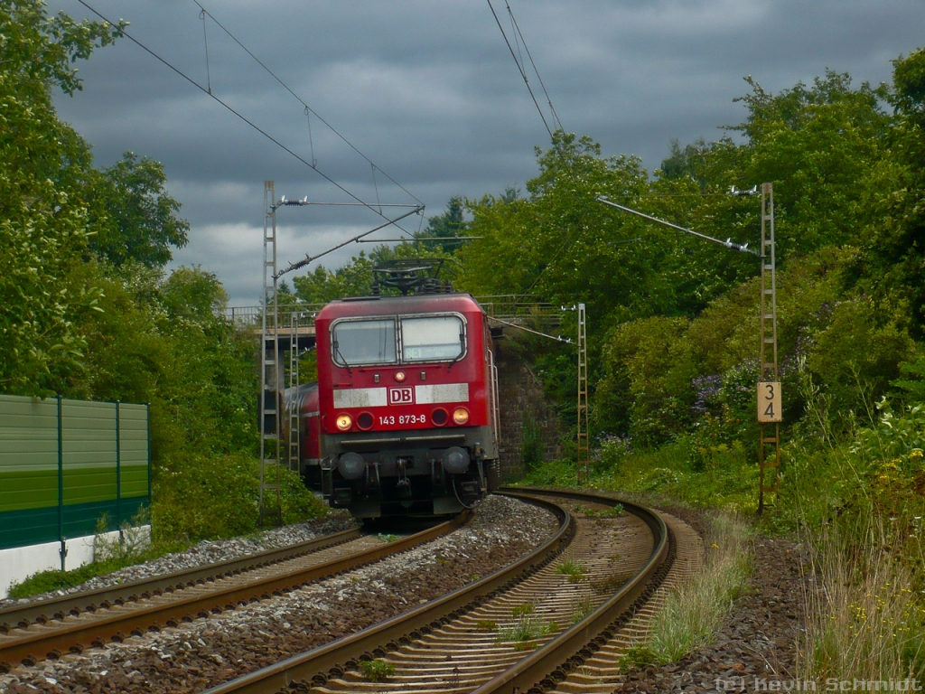 Tag 6: Unser erster Zwischenstopp war Koblenz-Moselweiß. Von diesem Haltepunkt aus hatten wir es nicht weit bis zu unserer ersten Fotostelle: der Gülser Moselbrücke. Hier biegt gerade ein RE von Koblenz nach Saarbrücken mit ziehender 143 873-8 um die Kurve zur Brücke.