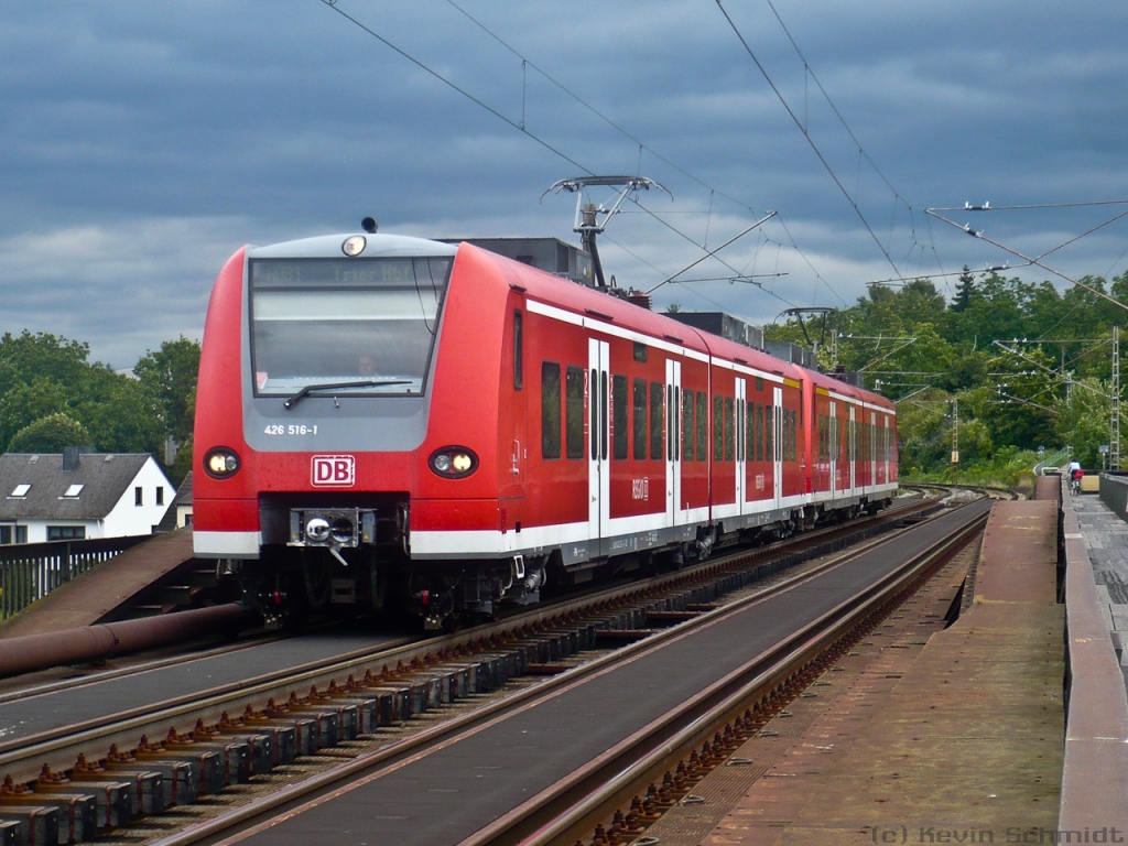 Tag 6: Zwei ET 426 überqueren auf der Fahrt als RB von Koblenz nach Trier die Mosel über die Gülser Moselbrücke.