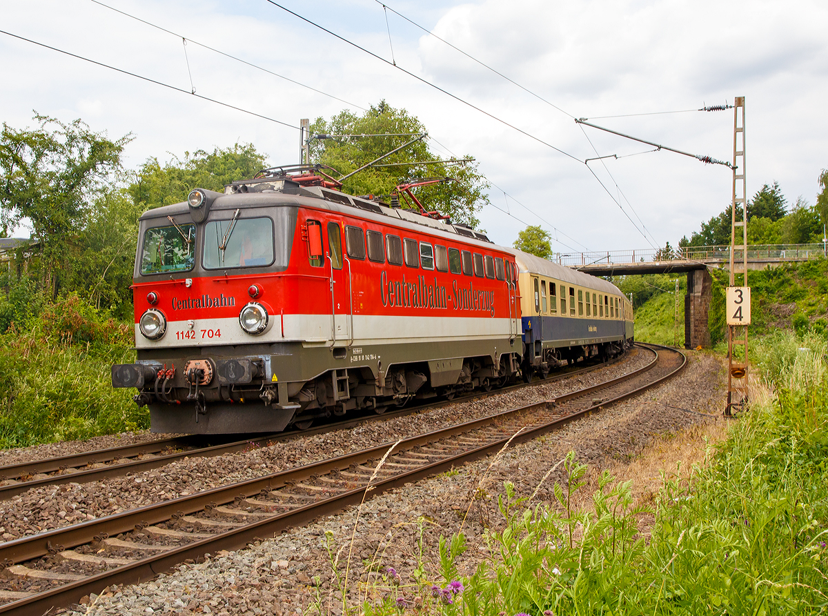 Die 1142 704-6 (A-CBB 91 81 1142 704-6) der Centralbahn AG, erreicht mit einem Sonderzug von Koblenz Hbf kommend, am 16.06.2017 bald die Moselbrücke in Koblenz-Moselweiß.