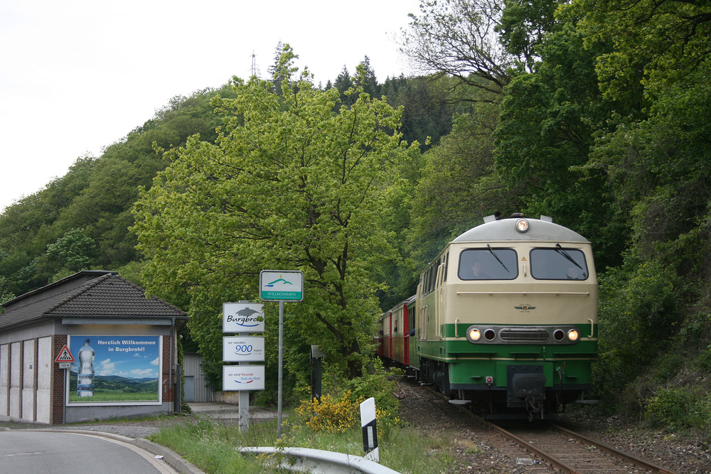 D 5 verlässt mit dem Vulkan-Express die Gemeinde Burgbrohl in Richtung Rheintal. Aufnahmedatum: 17.05.2012