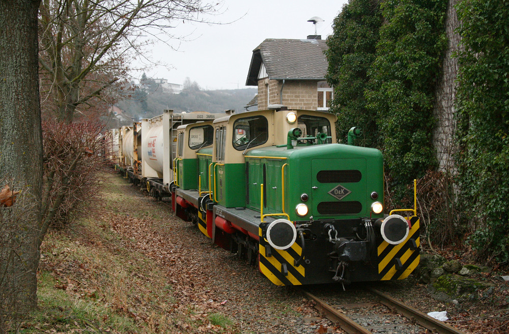 Loks der Brohltalbahn bei Rangierarbeiten im Bahnhof Brenk. In den Containern befindet sich Phonolith. Aufnahmedatum: 29.01.2012