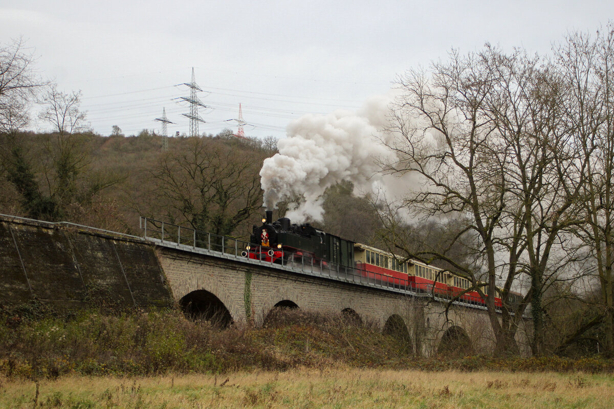 Die Dampflokomotive 11sm zog Anfang Oktober 2021 einen Personenzug über das Tönissteiner Viadukt.