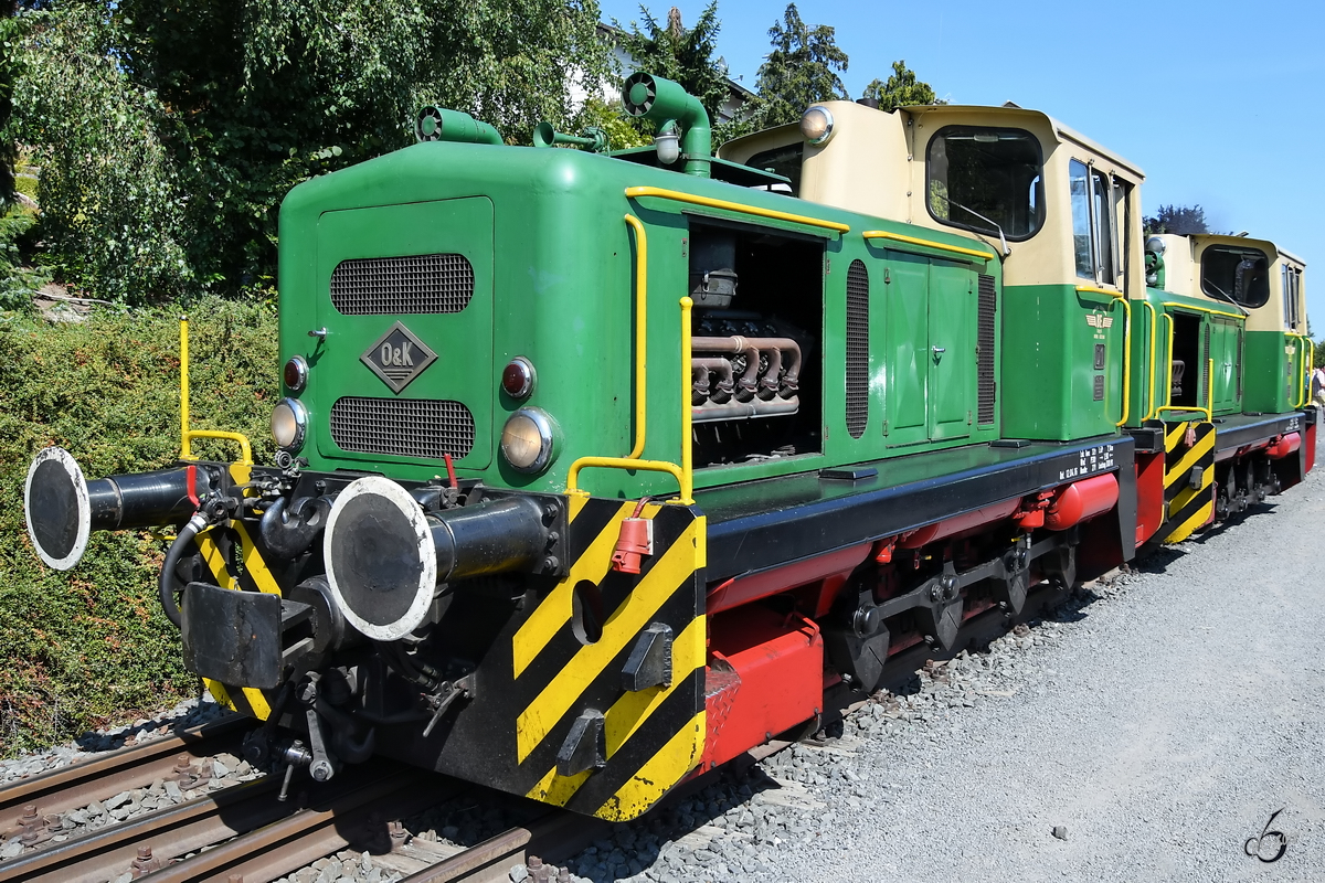 Nach einem Lokwechsel in Oberzissen ziehen die Diesellokomotiven O&K MV 10S  D1  &  D2   den Zug weiter zur Endhaltestelle Engeln. (August 2018)