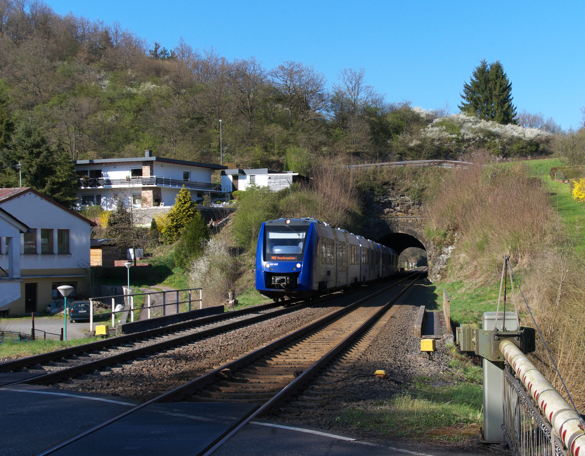 Durchblick...Wie schön, wenn man im Biergarten des Gasthauses "Am Bahnhof" sitzt und sofort auf die sich schließenden Schranken reagieren kann. 622 402 + 622 406 sind als RE3 nach Saarbrücken auf der Nahetalbahn unterwegs. Zwischen Idar-Oberstein und Neubrücke/Nahe sind es 18 Km, es werden 8 Tunnel durchfahren. Kurz vor dem Hp Nohen liegt der Bockspiel Tunnel, mit 120 Metern der kürzeste auf diesem Streckenabschnitt.