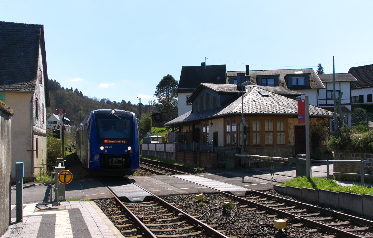 In Richtung Saarland geht es nur über den Umweg über Idar-Oberstein. 620 418 auf der Relation RE3 ist von Saarbrücken Hbf. nach Frankfurt am Main Hbf. unterwegs und braust nun durch den 380 Einwohner zählenden Ort Nohen. Der Hp Nohen wird auf beiden Seiten von einem Bahnübergang eingerahmt. Bahnstrecke 3511 Bingerbrück - Saarbrücken Hbf. am 18.04.2015 Erhard Pitzius