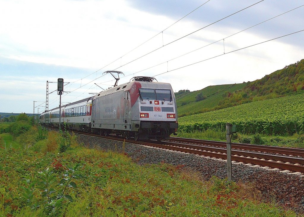 Die Werbelok 101 144 Hertha BSC ist hier bei Nackenheim in den Weinbergen rheinabwärts in Richtung Mainz mit einem aus der Schweiz kommenden IC unterwegs. Gleich erreicht der Zug den Bahnübergang an der L 431 Wormser Straße an diesem Sonntagnachmittag den 23.9.2012