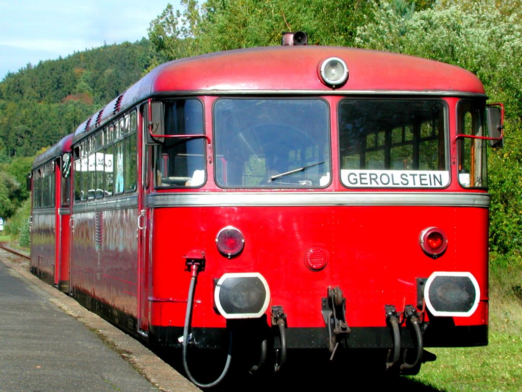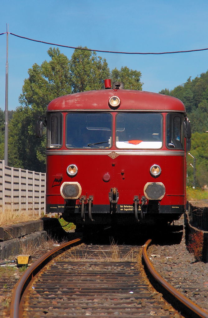 Am Samstag den 18.8.2012 steht der Triebwagen 798 670-6 abfahrbereit im Bahnhof Daun, in wenigen Sekunden fährt er weiter in Richtung Kaisersesch. Dieses Foto machte ich vom Übergang vom Bahnsteig zum Parkplatz aus... Andreas Strobel