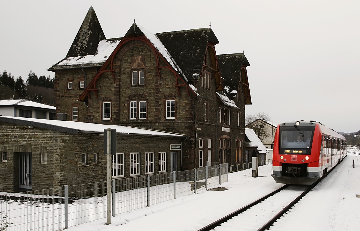 Mit einem RE nach Köln fährt ein unbekannter 620 am 28.02.2020 aus Jünkerath aus. Inzwischen erinnert hier nichts mehr an das früher für die Zugförderung auf der Eifelbahn wichtige Dampflokbetriebswerk... Horst Lüdicke