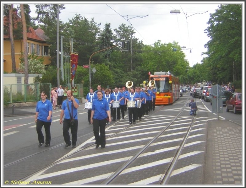 Der Straßenbahncorso am 03.06.2007 anläßlich der 100jährigen Wiederkehr der ersten Fahrt der elektrischen Straßenbahn nach Gonsenheim ähnelte einem kleinen Festzug, der auch von Musikgruppen begleitet wurde. Der Schlußwagen GT6M-Triebwagen 213 (Baujahr 1996 ADtranz/AEG) hatte beim Erreichen der Haltestelle Kapellenstraße die Blaskapelle als Geleit.