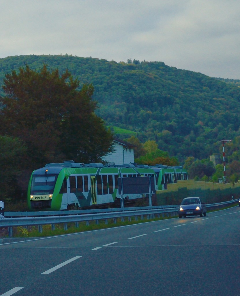 Nach Limburg fahrend kommt hier ein VECTUS Doppel bei Dausenau die Lahntalbahn hinauf gefahren.7.10.2013