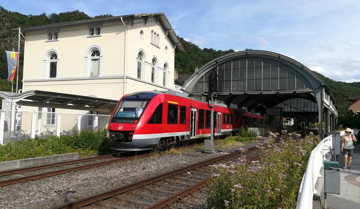 „Sehr geehrte Fahrgäste, der nächste Halt ist Nassau. Aufgrund einer Fahrzeugstörung endet dieser Zug außerplanmäßig hier.“ Was nun? Der nächste Zug kommt erst in einer dreiviertel Stunde! Ganz einfach: Schnell ein paar Schnappschüsse und dann im Supermarkt neben an die Vorräte für den Heimweg aufstocken. 648 201 wollte nicht mehr, weshalb die RB 12620 außerplanmäßig in Nassau (Lahn) endete. Hier das Bahnhofsgebäude mit dem streikenden Triebwagen im Hintergrund (21.06.2025) Leonhard Groß