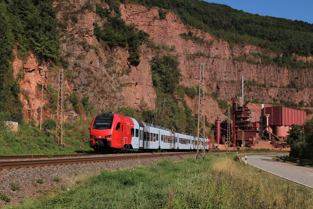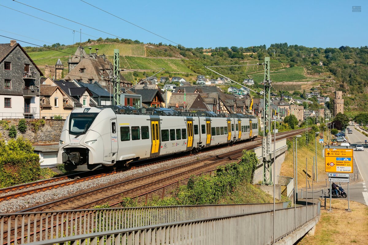 Der vierteilige Bombardier Talent 2 - 442 204 / 442 704 "Müden" fährt am 28.04.201, als RB 81 "Moseltalbahn" (Koblenz – Cochem – Trier), durch Koblenz-Moselweiß, gleich geht es auf der Gülser Eisenbahnbrücke über die Mosel. Armin Schwarz
