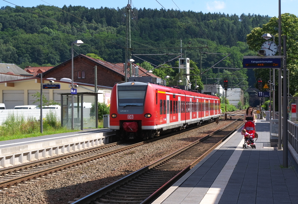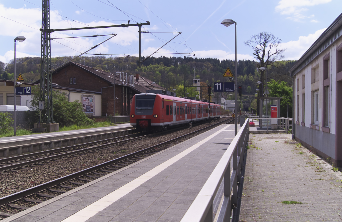 Mit 200 mm Brennweite hat man einen tollen Blick vom Vogelfelsen auf den Bahnhof Saarhölzbach oder auf das, was davon übrig geblieben ist. Im Jahr 2000 gab es noch 4 Durchgangsgleise, heute nur noch zwei und ein Stumpfgleis. Zu Zeiten der Bundesbahn und der Dampfloks endeten viele Züge in Saarhölzbach, hier ist nämlich die Grenze zu Rheinland-Pfalz. Dann wurde umgesetzt und die Nahverkehrszüge blieben im Saarland. Vor Personenzügen waren die Baureihen 23 und 50 eingesetzt. An der Saar gab es auch umgebaute 23er für den Wendezugdienst. Am 19.10.2012 hat ein 425er Doppel hat aus Trier kommend den Fahrgastwechsel vollzogen und beschleunigt nun in Richtung Mettlach. KBS 685 - Bahnstrecke 3230 Saarbrücken - Karthaus