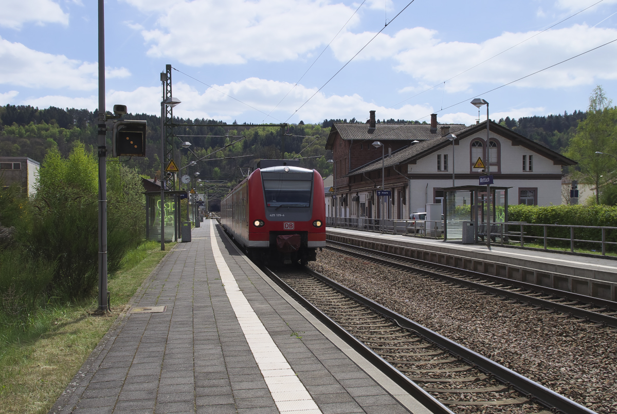 Am 19.10.2012 hat ein 425er Doppel hat aus Trier kommend den Fahrgastwechsel vollzogen und beschleunigt nun in Richtung Mettlach.