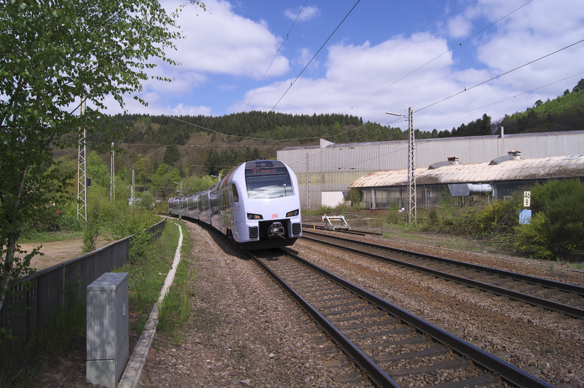 429 100 RE Koblenz - Mannheim kurz vor dem Bahnhof Mettlach Saar. Im Hintergrund die alten Werkshallen von Villeroy & Boch.  Am Mittag und frühen Nachmittag hat man vom Bahnsteigende bei Sonnenschein gute Lichtverhältnisse.