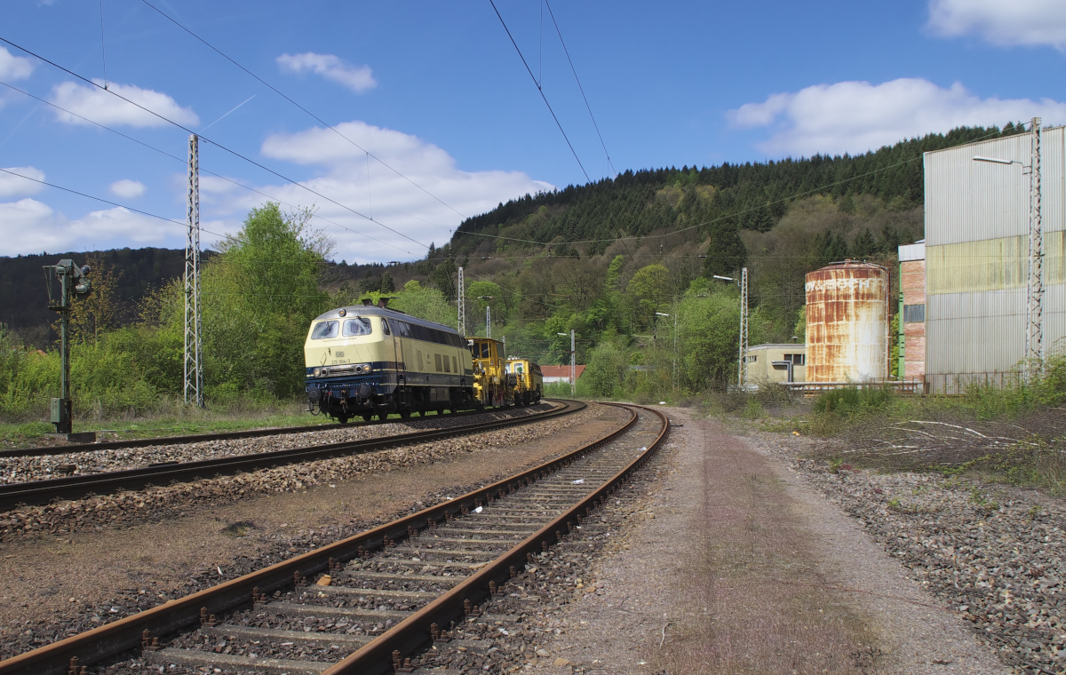 Bundesbahnflair in Mettlach Saar. 215 004-3 bringt eine Gleisstopfmaschine nach Merzig. Bahnstrecke 3230 Saarbrücken - Karthaus am 23.04.2017. Rechts die alten nicht mehr benutzten Werkshallen von Villeroy und Boch. Früher gab es hier mehrere Werksanschlußgleise. Heute ist V&B in Mettlach und in Merzig ohne Bahnanschluss.