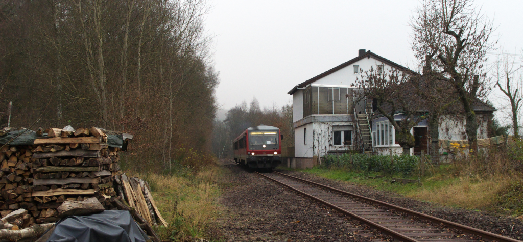 MORA C hat auch hier viele Güterkunden vom Bahntransport abgehängt, ein Werk von Hörmann in Freisen war ein guter Güterkunde. 628 452 hat die Steigung von Türkismühle her erklommen und passiert nun den ehemaligen Bahnhof in Nohfelden Süd. Ivonne Pitzius