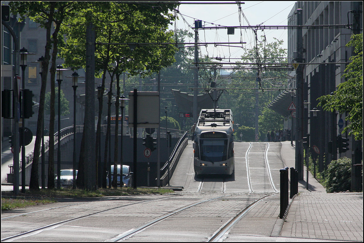 So wurde der Konflikt am Hauptbahnhof von Saarbrücken gelöst. In den sechziger oder siebziger Jahren hätte man es vielleicht umgekehrt gemacht. Die urbaner und fußgängerfreundlichere Lösung. Die Fahrgäste müssen nicht in ungemütliche Untergeschosse ausweichen, der Vorplatz des Bahnhofes wird vom Durchgangverkehr befreit und auch das Umsteigen zwischen Stadtbahn und Bus ist auf kurzem Weg möglich. Soweit ich mich erinnern kann halten hier die Busse und die Saarbahn am selben Bahn- bzw Bussteig.