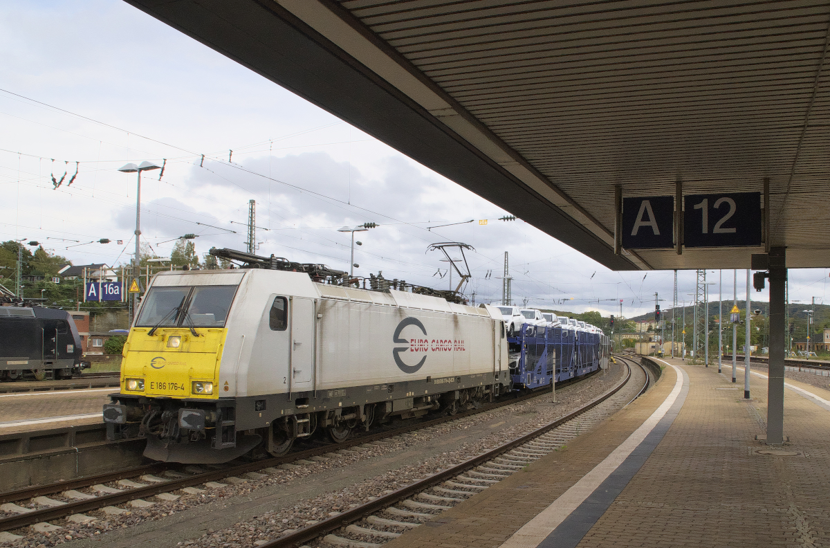 Selten fahren Güterzüge durch den Hauptbahnhof von Saarbrücken. Nur wenn sie über Strecke von Homburg über St. Ingbert geleitetet werden fahren die Züge den direkten Weg durch den Hbf. und fahren nicht über die Güterzugumfahrung. ECR E-186 176 ist mit einem Autotransportzug in Richtung Frankreich unterwegs. 21.10.2019 Erhard Pitzius