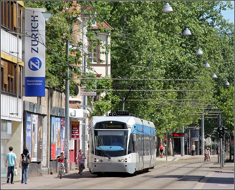 ... in der Großherzog-Friedrich-Straße in der Innenstadt Saarbrücken. Die gesamte Saarbahnstrecke durch Saarbrücken verläuft auf eigenem Bahnkörper. Im Hintergrund ist die Haltestelle Landwehrplatz erkennbar.