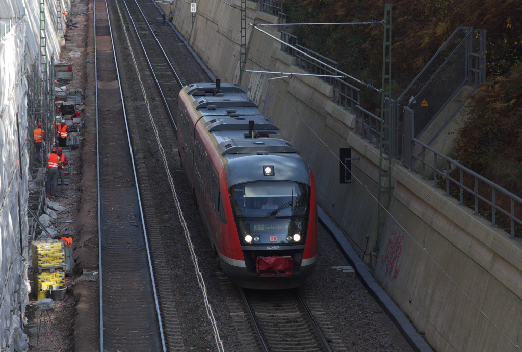 Zwischen Rohrbach und St. Ingbert wird an der KBS 670 schon seit Monaten gebaut. Durch den Bau von Stützmauern am Hang gibt es schon lange dort eingleisigen Verkehr.