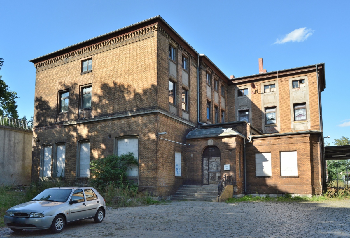 Blick auf das 2 stöckige Bahnhofsgebäude in Güterglück. Durch die oben führende Kanonenbahn musste das Bahnhofsgebäude 2stöckig sein um auf die dortigen Bahnsteige zu gelangen. Heute ist das Bahnhofsgebäude teilweise bewohnt auch wenn es nicht den Anschein erweckt und die Kanonenbahn oben ist stillgelegt.