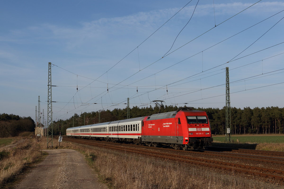 101 135-2 zieht den IC 2239 "Warnow" (Rostock - Leipzig) dem nächsten Halt Magdeburg Hbf entgegen. Fotografiert am 26.03.2016 in Angern-Rogätz. Christian Geschonneck