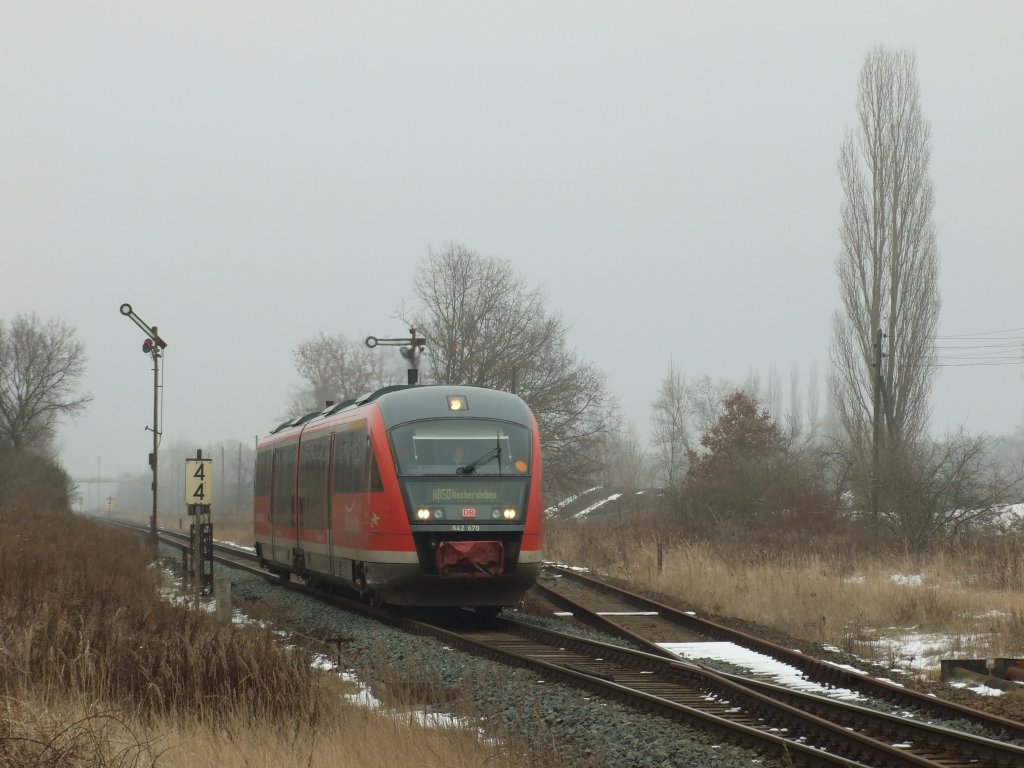 Auf der KBS 334 fährt 642 670 als RB 27918 von Dessau nach Aschersleben, hier zwischen den Haltepunkten Dessau-Alten und Dessau-Mosigkau. Gesehen am westlichen Ende des HP Dessau-Alten. Dessau, der 13.2.13