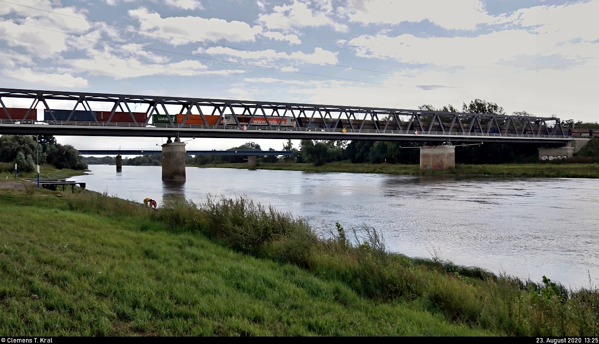 Beinahe unbemerkt vom Fotografen befährt ein Kohlezug mit 264 0?? (Voith Maxima 40 CC) nahezu zeitgleich mit einem Containerzug die Elbebrücke Roßlau. Beide Züge sind Richtung Bahnhof Roßlau(Elbe) unterwegs.