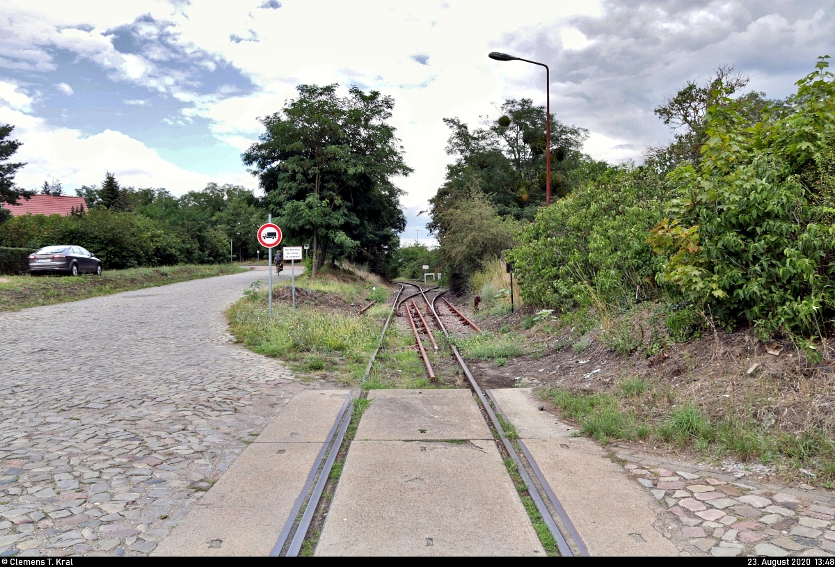 Blick durch den Zaun auf das Anschlussgleis vom Bahnhof Roßlau(Elbe) zur Roßlauer Schiffswerft (Roßlauer Schiffswerft GmbH & Co. KG (RSW)). Durch Zufall entdeckt.