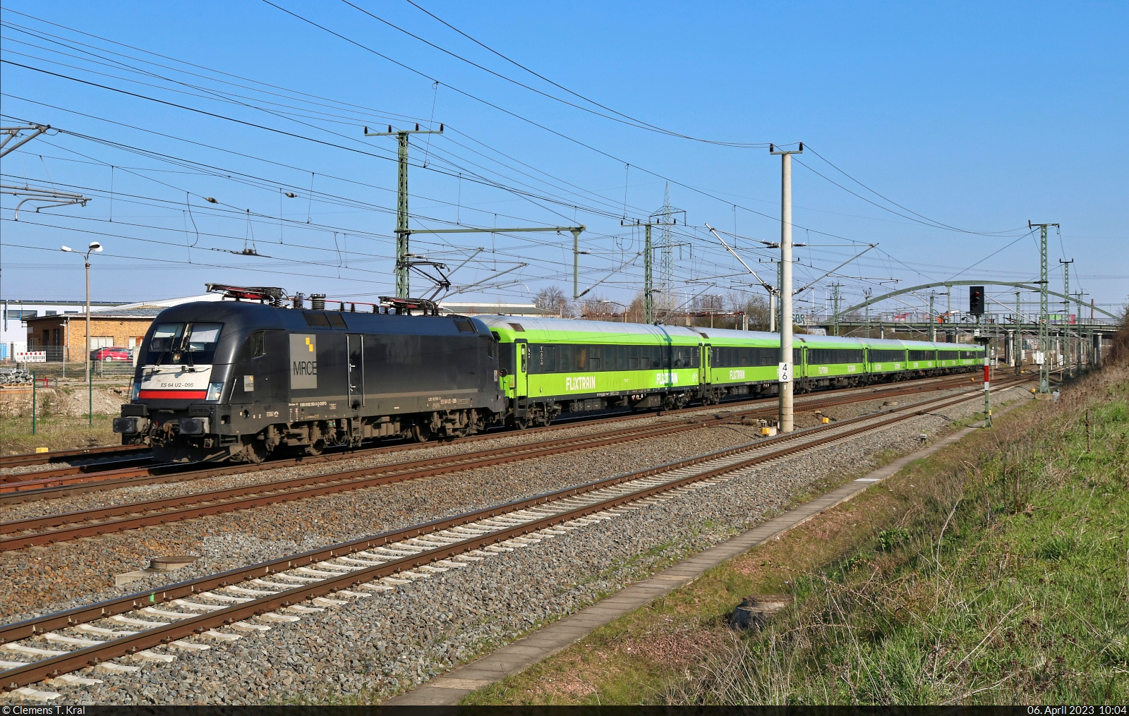 Mit beträchtlicher Verspätung fährt der Flixtrain mit 182 595-9 (Siemens ES64U2-095) in Halle-Ammendorf, Eisenbahnstraße, aus der Saalestadt.