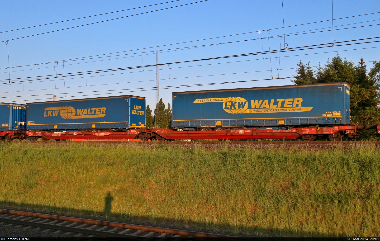 Sechsachsiger Doppel-Taschenwagen mit der Bezeichnung "Sdggmrs 738.1" (31 80 4955 447-6 D-DB), beladen mit Aufliegern der LKW Walter Internationale Transportorganisation AG und gezogen von 193 318-3 (Siemens Vectron) am Birkhahnweg in Halle (Saale) Richtung Bitterfeld. 🧰 DB Cargo 🕓 20.5.2024 | 20:02 Uhr