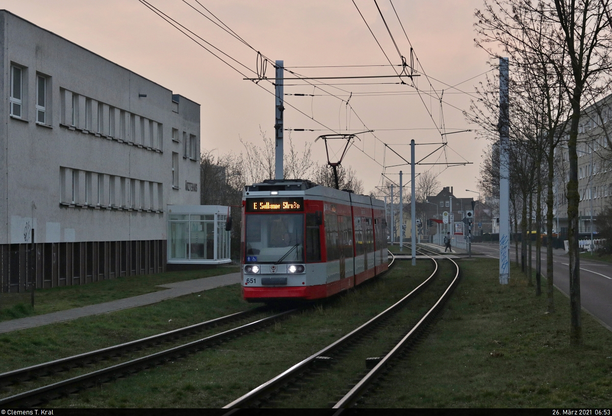 Duewag/Siemens MGT6D, Wagen 651, als Zusatzfahrt in der Wolfsburger Straße, kurz vor der Haltestelle An der Eselsmühle in Halle (Saale). Diese zusätzliche Straßenbahn bindet Halle-Neustadt morgens an mehrere Schulen in der Südstadt an, die wegen der baubedingt eingestellten S-Bahn-Linie S7 für die Schüler deutlich schlechter erreichbar sind. Waren es mit der S-Bahn nur 5 Minuten, müssen nun mindestens 30 Minuten Fahrzeit für den Schulweg eingeplant werden. 🧰 Hallesche Verkehrs-AG (HAVAG) 🚋 Linie 8E Soltauer Straße–Elsa-Brändström-Straße 🕓 26.3.2021 | 7:02 Uhr