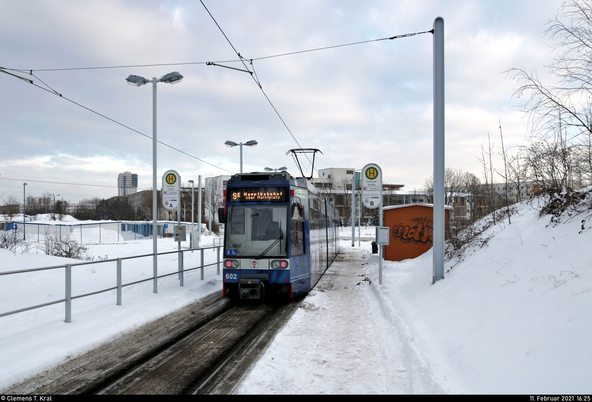 Duewag/Siemens MGT6D, Wagen 602, mit Werbung für die Merkur Spielbank Halle (Saale), steht in der Endstelle Soltauer Straße. Normalerweise fährt hier die Linie 2, doch wegen Schnee und Eis und damit verbundenen starken Einschränkungen im ÖPNV wurde Halle-Neustadt lediglich von einer Ringlinie bedient, die es im normalen Betrieb so nicht gibt. 🧰 Hallesche Verkehrs-AG (HAVAG) 🚋 Linie 9E ↺ Soltauer Straße–Glauchaer Platz–Marktplatz–Am Steintor–Riebeckplatz–Hauptbahnhof–Betriebshof Freiimfelder Straße–Am Steintor–Riebeckplatz–Glaucher Platz–Soltauer Straße 🕓 11.2.2021 | 16:25 Uhr