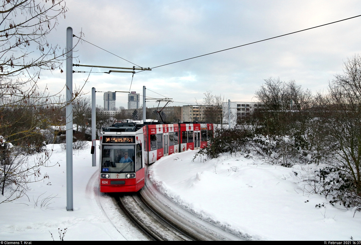 Duewag/Siemens MGT6D, Wagen 624, mit Werbung für die Saalesparkasse, auf der witterungsbedingt eingesetzten Linie 9E in der Wendeschleife Soltauer Straße. 🧰 Hallesche Verkehrs-AG (HAVAG) 🚋 Linie 9E ↺ Soltauer Straße–Glauchaer Platz–Marktplatz–Am Steintor–Riebeckplatz–Hauptbahnhof–Betriebshof Freiimfelder Straße–Am Steintor–Riebeckplatz–Glaucher Platz–Soltauer Straße 🕓 11.2.2021 | 16:37 Uhr