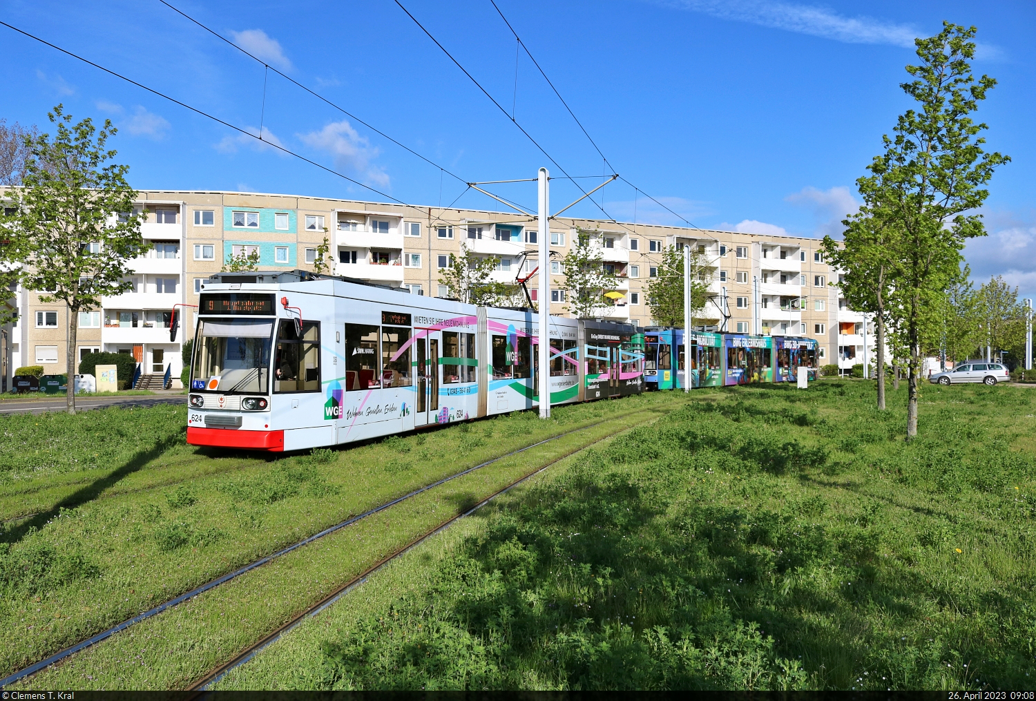 Die für die Wohnungsbaugenossenschaft „Eisenbahn“ e.G. und Bau- und Wohnungsgenossenschaft Halle - Merseburg e.G. (BWG) werbenden Wagen 624 und 623 vom Typ Duewag/Siemens MGT6D wurden an der Wolfsburger Straße in Halle (Saale) aufgenommen. 🧰 Hallesche Verkehrs-AG (HAVAG) 🚋 Linie 9 Soltauer Straße–Hauptbahnhof 🕓 26.4.2023 | 9:08 Uhr