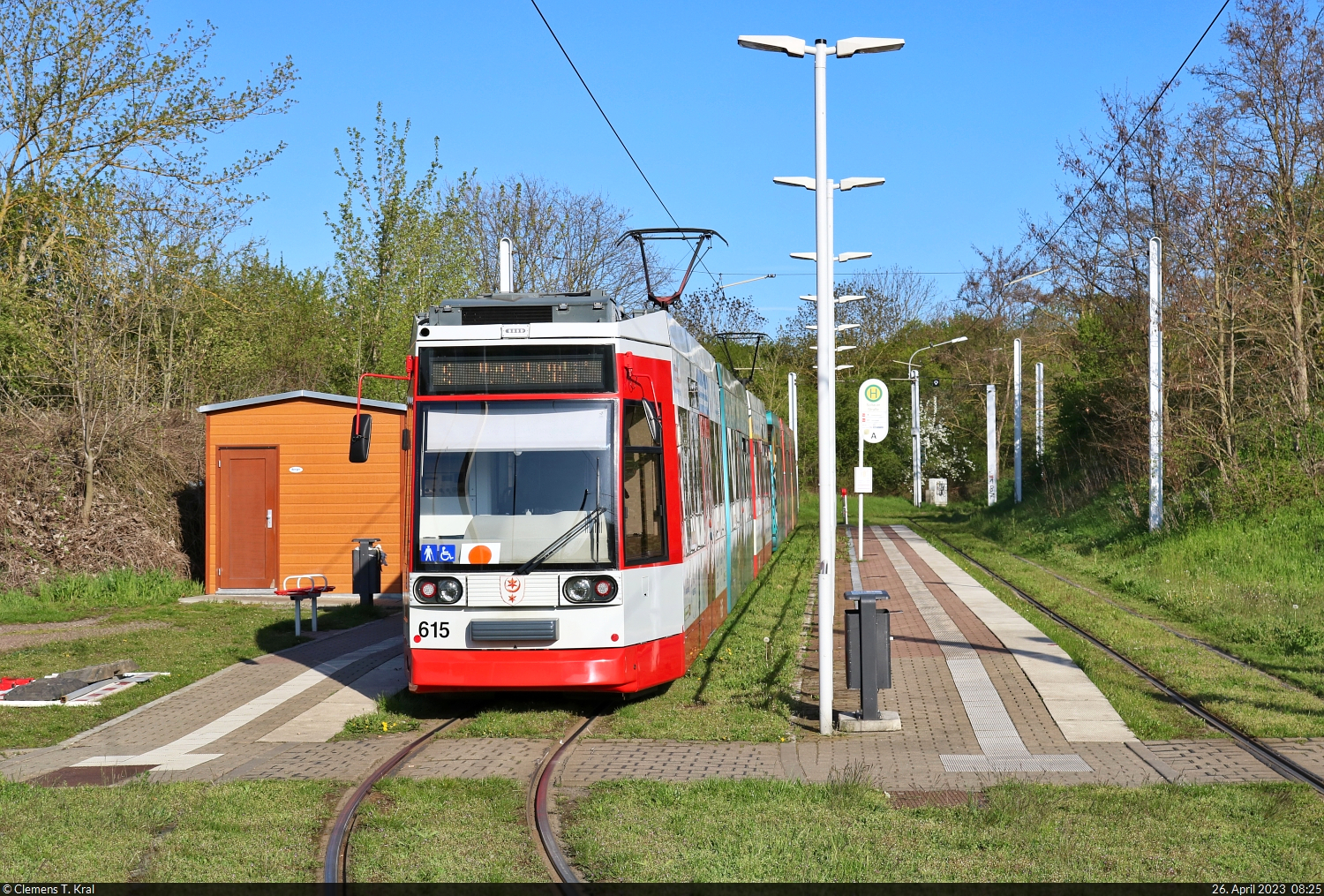 Duewag/Siemens MGT6D, Wagen 615 und 611, warten in der Haltestelle Soltauer Straße in Halle (Saale) auf Abfahrt. 🧰 Hallesche Verkehrs-AG (HAVAG) 🚋 Linie 9 Soltauer Straße–Hauptbahnhof 🕓 26.4.2023 | 8:25 Uhr