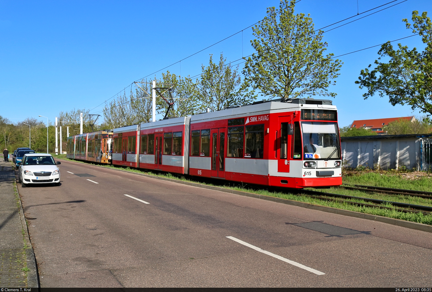 Eine Duewag/Siemens-MGT6D-Doppeltraktion wurde zu Beginn ihrer Fahrt an der Soltauer Straße in Halle (Saale) aufgenommen. Wagen 615 führt, an zweiter Stelle hängt Wagen 611, der für die Schokoladenerlebniswelt von Halloren wirbt. 🧰 Hallesche Verkehrs-AG (HAVAG) 🚋 Linie 9 Soltauer Straße–Hauptbahnhof 🕓 26.4.2023 | 8:35 Uhr