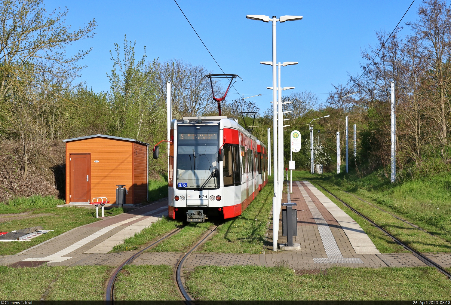 MGT-K (Bombardier Flexity Classic), Wagen 676 und 675, pausieren in der Endstelle Soltauer Straße in Halle (Saale), die als Wendeschleife ausgeführt ist. 🧰 Hallesche Verkehrs-AG (HAVAG) 🚋 Linie 9 Soltauer Straße–Hauptbahnhof 🕓 26.4.2023 | 8:13 Uhr
