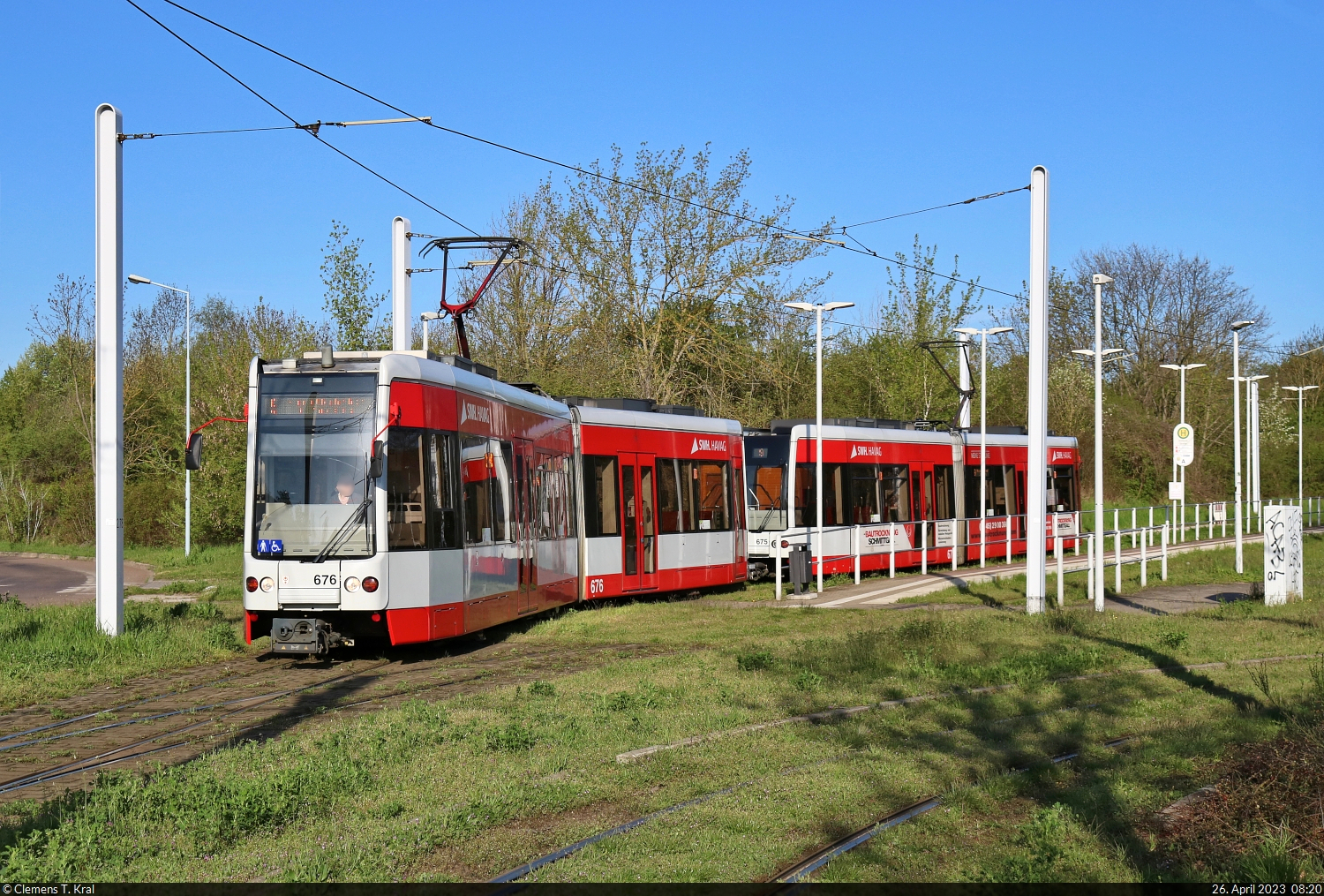 MGT-K (Bombardier Flexity Classic), Wagen 676 und 675, brechen in der Haltestelle Soltauer Straße in Halle (Saale) zu einer neuen Fahrt auf. 🧰 Hallesche Verkehrs-AG (HAVAG) 🚋 Linie 9 Soltauer Straße–Hauptbahnhof 🕓 26.4.2023 | 8:20 Uhr