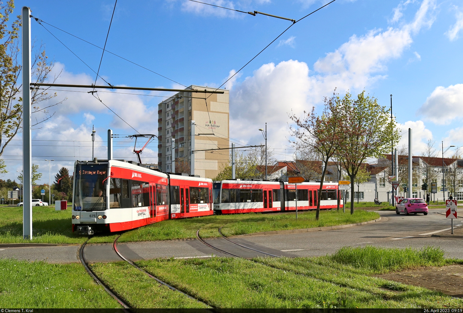 MGT-K (Bombardier Flexity Classic), Wagen 675 und 676, queren den Kreisel am Göttinger Bogen in Halle (Saale). 🧰 Hallesche Verkehrs-AG (HAVAG) 🚋 Linie 9 Hauptbahnhof–Göttinger Bogen 🕓 26.4.2023 | 9:19 Uhr