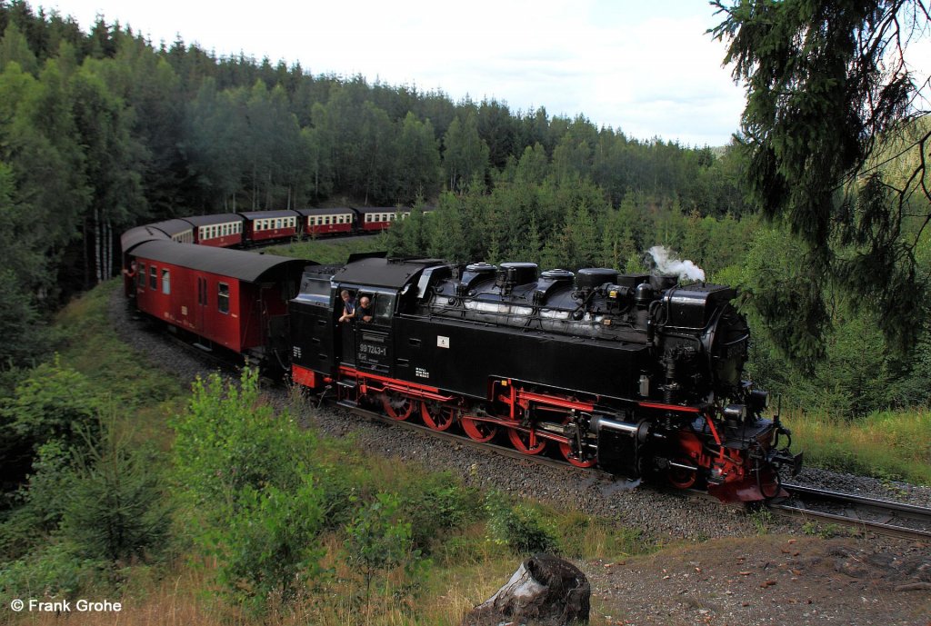 99 222 hatte am 05.10.2024 Zug 8944 vom Brocken nach Wernigerode am Haken. Gerade durchfährt der Zug die 180°-Kehre unterhalb des Bahnhofes Steinerne Renne und fährt weiter in Richtung Hasserode. Michael Brunsch